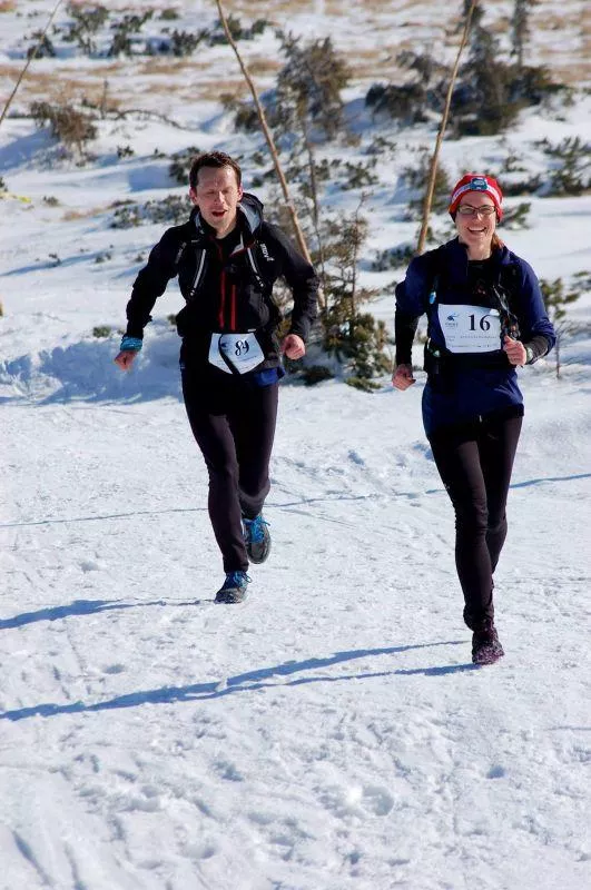 O 4 rano rozpoczęła się kontrola obowiązkowego wyposażenia, a kilka minut przed piątą deptak w Karpaczu przejęli biegacze, migając lampkami jak chmara świetlików. Po szybkim zbiegu po asfalcie, rozpoczęliśmy podejście do Budnik. Na tym etapie nie mogliśmy podziwiać widoków, dopiero zaczynało się przejaśniać i lepiej było się skupić na technicznym zbiegu po kamieniach. Po przekroczeniu strumienia wybiegliśmy na asfalt, więc na drodze do Kowar można było się rozpędzić. Ostatnie 5 km do pierwszego punktu kontrolnego na Przełęczy Okraj upłynęło pod znakiem zdobywania wysokości. W górnej części szlak był częściowo zlodzony, jednak stwierdziłam, że z wyciąganiem raczków jeszcze trochę poczekam. Biegłam w niewielkiej odległości od Filipa i jego psa Superkomandosa, który doskonale radził sobie w tym terenie. Zastanawiam się, skąd właściwie wzięło się powiedzenie „ślizgać się jak pies na lodzie”?