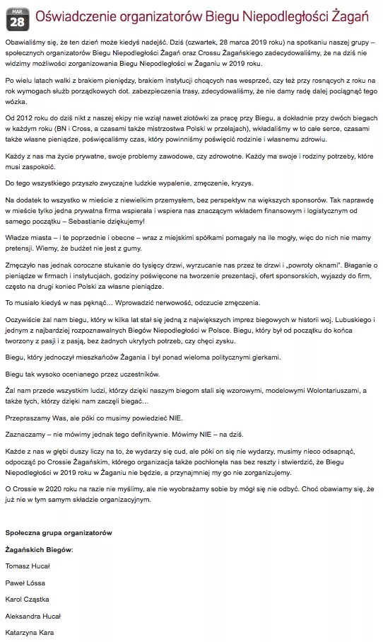 Pełna treść oświadczenia organizatorów Biegu Niepodległości w Żaganiu: