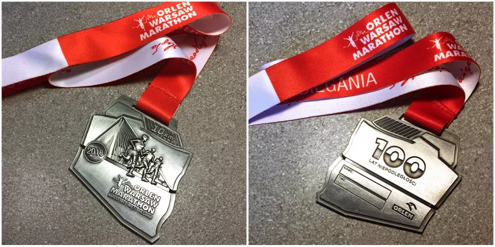 Wszyscy uczestnicy biegu OSHEE 10 km, którzy przekroczą linię mety ORLEN Warsaw Marathon, otrzymają pamiątkowy medal. Podobnie jak koszulka, jego wzór nawiązuje do obchodzonego w tym roku 100-lecia odzyskania niepodległości przez Polskę.