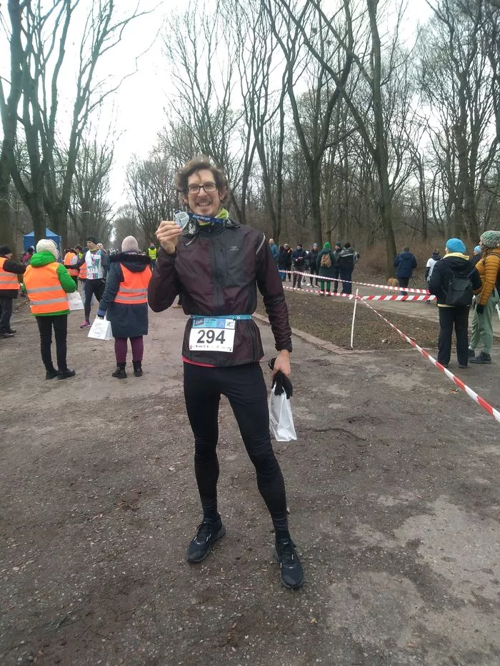 Sama trasa przebiegała tradycyjnie po asfalcie wokół parku. Płaska, szybka bez ostrych zakrętów pozwoliła mi na zajęcie 7 miejsca open. Warunki pogodowe były całkiem przyjemne. Plus 4 stopnie i wyglądające słońce. Po biegu zniknęło, ale przynajmniej nie padał deszcz. Na mecie medal, dwie czekolady, baton, chałwa oraz grochówka i ciepła herbata. Do tego voucher na gorącą czekoladę do wykorzystania w pijalniach Wedla na terenie Warszawy. Nigdy z niego nie skorzystałem gdyż jest ważny tylko 2 tygodnie. Jedyna lokalizacja dogodna dla mnie jest zamknięta po biegu, a ja nie jestem z Warszawy. Dorośli biegacze (biegi główne) mieli w pakiecie jeszcze pas startowy. Fajny gadżet. Jednak z roku na rok jest na tej imprezie biedniej. Może przez szalone lata wojny i inflacji. Nagrody też tylko dla zawodników z klasyfikacji open.