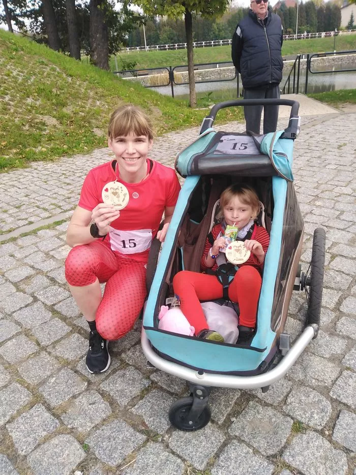 Dzięki temu że bieg został przeniesiony z września (warunki atmosferyczne poprzednio uniemożliwiły organizacje imprezy) to miałam okazję wziąć w nim udział razem z córką. Nie było typowej klasyfikacji według wbiegnięcie na metę. Upominki otrzymało pierwsze 10 par (vouchery do kina, na spektakl teatralny czy też kolacje w pobliskiej restauracji). Dodatkowo wyróżniono uczestników ciekawie przebranych, najmłodsze pary i najstarszą. Co ciekawe najstarsza para była zarazem parą która brała udział we wszystkich edycjach.