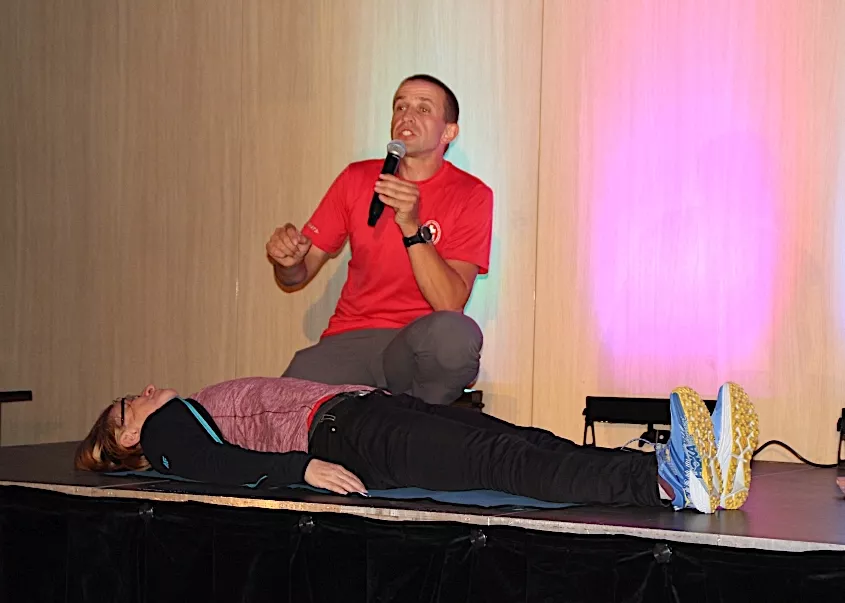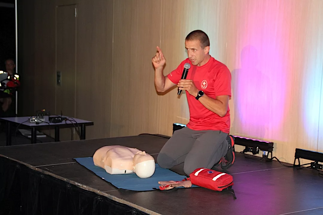 Ratownik szczególnie uczulił uczestników prezentacji, by nie pozostawać obojętnym na współuczestników biegu z kłopotami zdrowotnymi, koniecznie udzielać pierwszej pomocy i wzywać pomoc. Rozpoczął od najbardziej drastycznych przypadków zagrożenia życia – zatrzymania oddechu i akcji serca. W każdym przypadku należy wtedy wezwać pomoc, a także – jeśli nie chcemy lub nie możemy prowadzić sztucznego oddychania metodą usta-usta (po dwa wydechy naraz) – przynajmniej wykonywać masaż serca w tempie 100-120 uciśnięć na minutę na środek mostka, do przywrócenia akcji serca lub przybycia ratowników.
