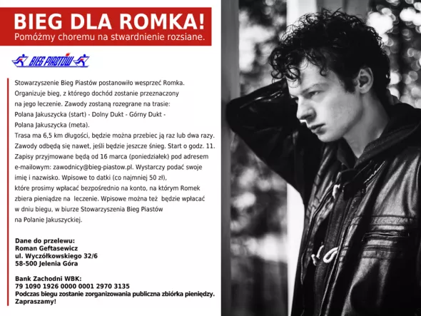 11 kwietnia na Polanie Jakuszyckiej Stowarzyszenie "Bieg Piastów" organizuje bieg dla Romka, chorego na stwardnienie rozsiane. Do wyboru są dwa dystanse 6,5 i 13 km. Szczegóły imprezy poniżej.