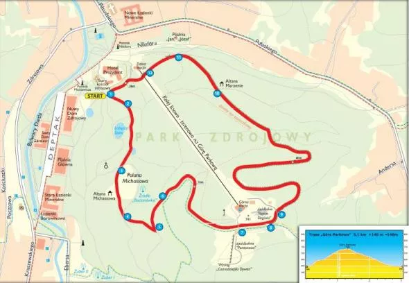 Trasa bierze swój początek przy największym skrzyżowaniu alejek na Górze Parkowej, nad starym kościółkiem zdrojowym i hotelem ?Prezydent?. Pierwsze fragmenty ścieżki prowadzą łagodnie szeroką alejką, obok Łabędziego Stawu. Po 400 metrach pojawia się pierwszy stromy podbieg, który prowadzi na Polanę Michasiową.