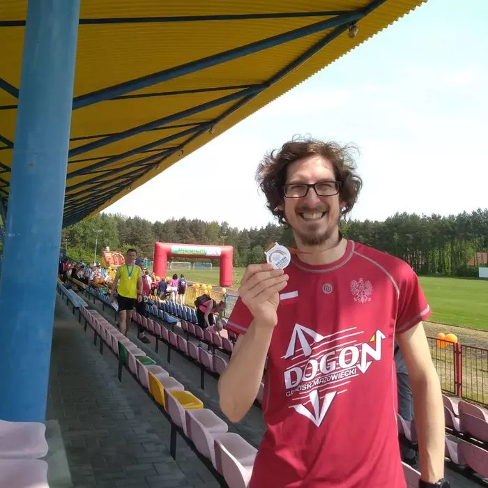 Start i meta znajdowały się na stadionie piłkarskim. Pakiety startowe zawierały cukierki, wodę, izotonik, smycz z logo fundacji. Do tego stół z przysmakami jak ciasto, owoce, napoje. Z domu na start biegiem ponad 8km. Na skróty byłoby 7 ale po co jak można zaliczyć dwa segmenty na Stravie. Potem zawody na 10 i na koniec bieg do domu już skrótem niecałe 7. Podczas zawodów okazało się, że jestem drugi, więc przycisnąłem nieco mocniej. I tak trafiło się podium.