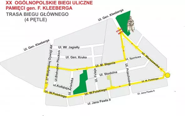 Start i meta znajdować się będą przy pomniku generała Kleeberga. Biuro zawodów zlokalizowane jest w sekretariacie Szkoły Podstawowej w Kocku przy ulicy ul. Przechodnia 11. W dniu zawodów czynne będzie od godziny 9. Bieg główny wystartuje o 10:30.