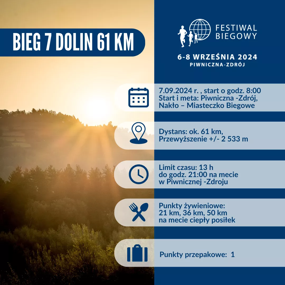 Jednym z biegów, który wymaga największego nakładu sił jest Bieg 7 Dolin na 61 km. Na starcie zawsze pojawiają się zawodnicy spragnieni mocnych wrażeń. Niektórzy pokonują ten dystans pierwszy raz w życiu, inni są z kolei stałymi bywalcami. Każdy bawi się jednak doskonale.