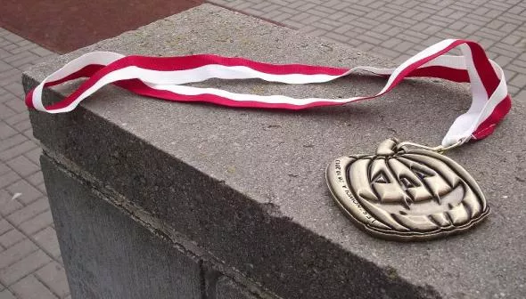 Na mecie oprócz izotonika i bonu żywnościowego otrzymałem jeden z najciekawszych w mojej biegowej karierze medali w kształcie dyni...