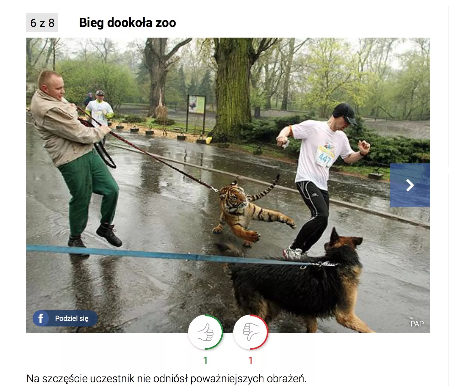 Pozostaje jeszcze kwestia tygrysicy sumatrzańskiej. Chociaż sprawa jest stara, na nowo rozpala emocje. Zoja, tygrysica wychowana przez ludzi, w 2009 r. była atrakcją biegu. Jednak jej udział w imprezie okazał się kontrowersyjny. Roczne wówczas, 57-kilogramowe zwierze miało w zwyczaju wychodzić na spacery, być prowadzone na smyczy przez swojego opiekuna i w towarzystwie psa, z którym na co dzień przebywała. Podczas biegu wyszła na taki właśnie spacer i zetknęła się z biegaczami, co utrwalił m.in. fotoreporter PAP (zdjęcie i komentarz za Wirtualną Polską):
