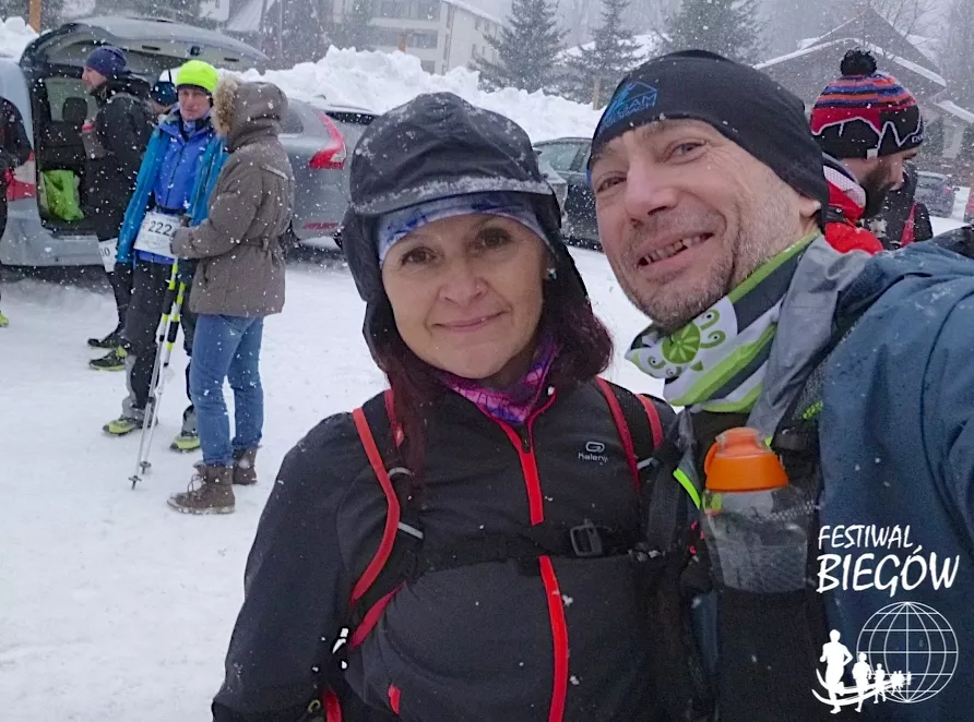 A single file of racers walks up the path broken in the snow. Broken, big deal. You can't break a path in this powder. And more snow keeps falling from above. The first loop is always a nice warm-up and chinwag with friends. It's already the third time here for Chloe. Mervyn is a rookie, like most of the foreign bunch. In a varying line-up they've shown up here since the beginning of Zamieć. It's always fun to hear them try to pronounce Szczyrk and Skrzyczne.