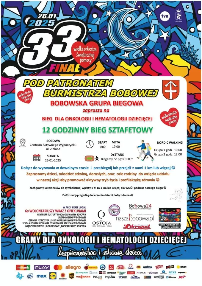 - Czekamy na Was w sobotę 25 stycznia w godzinach 7:00- 19:00. Biegamy po pętli 950 metry wokół Strefy Aktywnego Wypoczynku. W każdym momencie trwania naszego biegu możesz do nas dołączyć i wspólnie z nami pokonywać kilometry. Podczas trwania biegu będziemy zbierać datki w ramach 33. Finału WOŚP - w tym roku gramy dla onkologii i hematologii dziecięcej. Zapraszamy dzieci, młodzież szkolną, dorosłych oraz całe rodziny do wzięcia udziału w naszej akcji. Pokażmy, że wspólnie możemy naprawdę zdziałać wiele. Przejdź lub przebiegnij z Nami chociaż 1 km i dołóż swoją cegiełkę do leczenia dzieci. Będziemy czekać na Was przez 12 godzin niezależnie od pogody – informują członkowie Bobowskiej Grupy Biegowej.