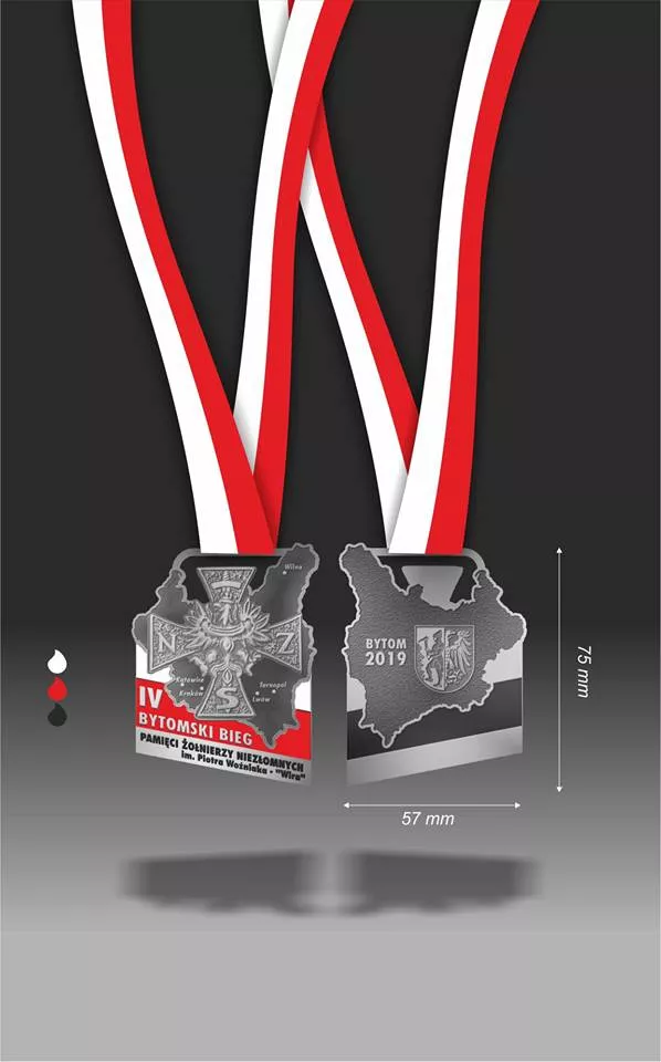Dwa lata temu motywem był symbol Polski Walczącej wpisany w kształt granic II Rzeczpospolitej, czyli obszaru, na którym walczyli Żołnierze Niezłomni. Przed rokiem medal Bytomskiego Biegu Pamięci Żołnierzy Niezłomnych łączył znak Polski Walczącej z symbolem Związku Jaszczurczego, na bazie którego w 1942 roku powstały Narodowe Siły Zbrojne. Tegoroczny medal utworzy symbol Narodowych Sił Zbrojnych wpisany w kształt granic II RP i umieszczony na tle flagi Polski.