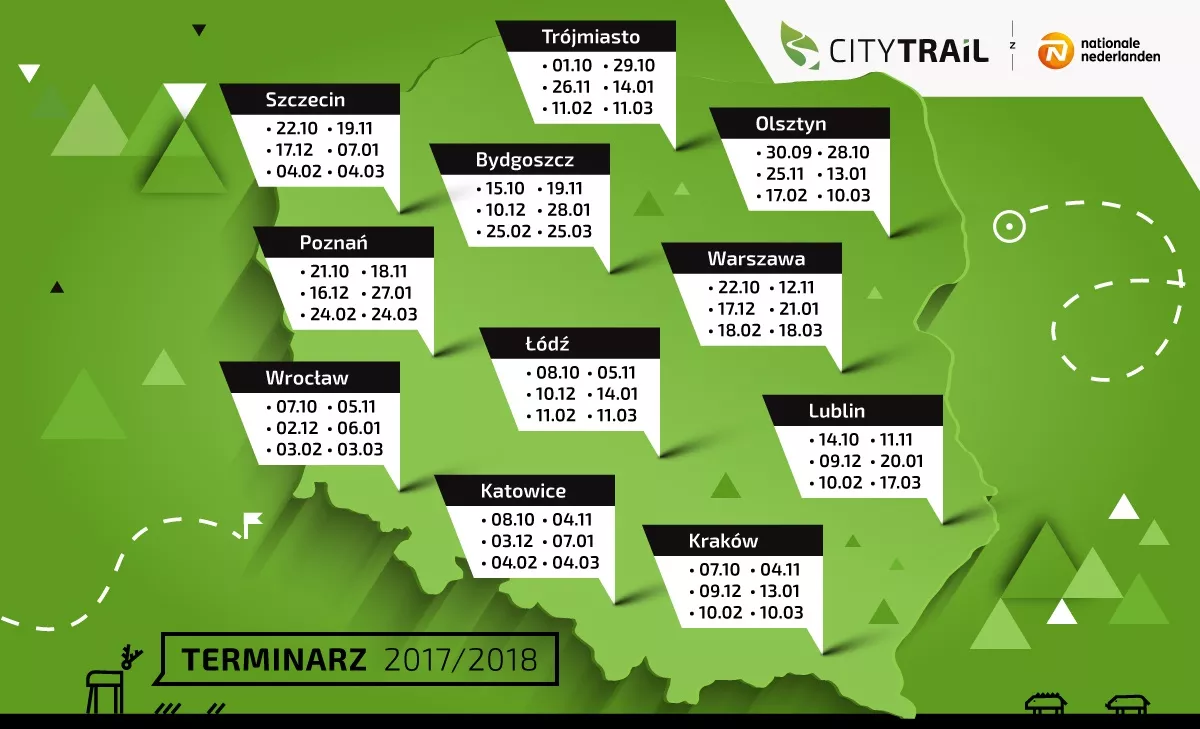 Ruszyły zapisy do największego biegowego cyklu w Polsce – Grand Prix CITY TRAIL z Nationale-Nederlanden. Początek sezonu 2017/2018 już 30 września w Olsztynie. Kolejna – szósta już ogólnopolska edycja cyklu będzie odbywać się w 11 lokalizacjach – do Bydgoszczy, Katowic, Lublina, Łodzi, Olsztyna, Poznania, Szczecina, Trójmiasta, Warszawy i Wrocławia dołącza Kraków. Tym samym w ramach jednego sezonu odbędzie się aż 66 biegów – po sześć w każdym z miast.
