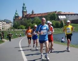 Pogoda nieoczekiwanie popsuła się, ale jest dobra do biegania - 12st. C i w pierwszej połowie biegu siąpi niewielka mżawka. Początkowo biegniemy w dużym tłoku , właściwie trasa rozluźnia się dopiero po opuszczeniu starówki i okrążeniu Wawelu. Na starówce stoi dość dużo kibiców, którzy nas dopingują, później robi się już spokojniej, gdy ruszamy w stronę Nowej Huty. Ponieważ mój GPS odmówił posłuszeństwa, mam kłopoty z ustaleniem tempa biegu, oznaczenia kilometrów są prawie niewidoczne na trasie. Punkty pojenia i odżywiania rozlokowane dosyć często, co 4 km, jest woda, izotonik , czekolada i banany, ale jest mało wolontariuszy podających kubeczki, co powoduje zamieszanie i nie zawsze na stole stoją kubki z wodą. Nie ma gąbek do odświeżania, a swoją gubię gdzieś około15 km. Jak zwykle piję mało od 15 km po dwa łyki wody.
