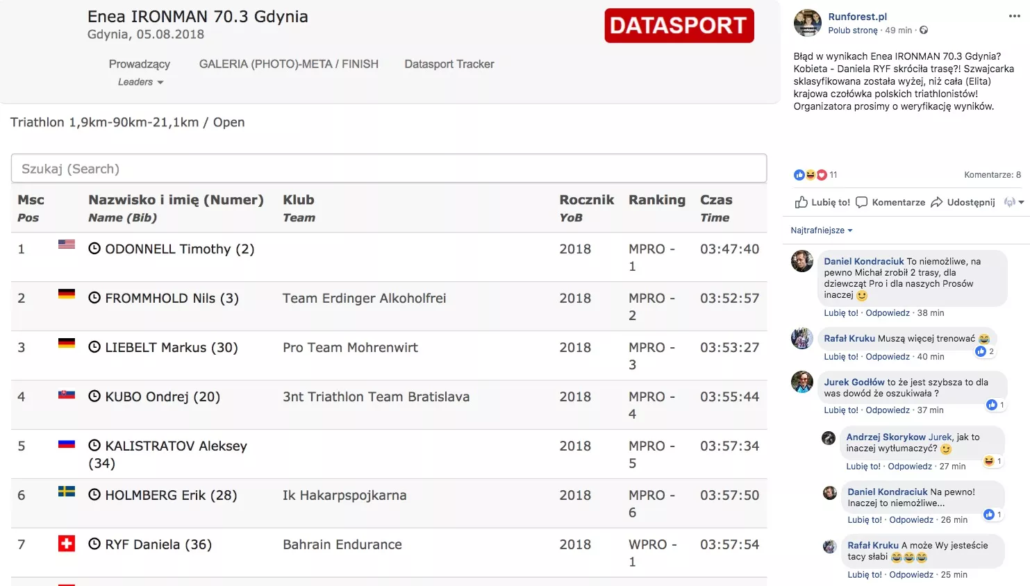 "Szwajcarka sklasyfikowana została wyżej, niż cała (Elita) krajowa czołówka polskich triathlonistów! Organizatora prosimy o weryfikację wyników."