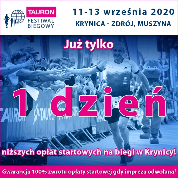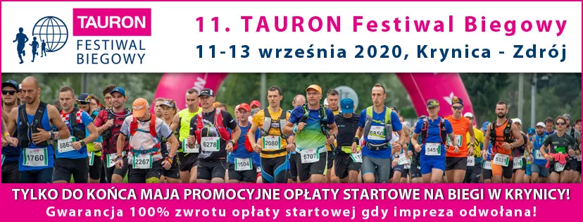 Już tylko do PÓŁNOCY możecie się zapisywać na 11. TAURON Festiwal Biegowy z promocyjnymi opłatami startowymi. Warto zapamiętać tę datę i jeśli planujecie start we wrześniu w Krynicy, dokonać zgłoszenia i wnieść opłatę startową już teraz. Zapisujecie się bez ryzyka - gwarantujemy zwrot 100% opłaty startowej w przypadku odwołania imprezy przez ograniczenia rządowe związane z COVID-19.