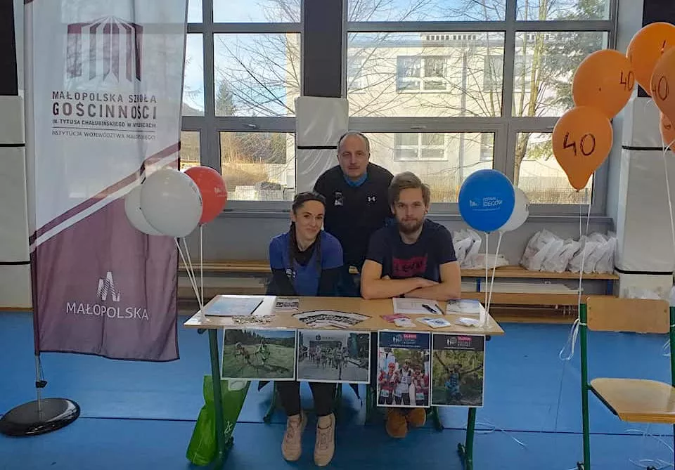 10 marca zaczął się dla mnie wyjątkowo nader wcześnie, gdyż już o 5:30. Niespełna godzinę później byłem już w drodze na bieg do Myślenic. Droga nie napawała optymizmem – co krok można było dostrzec efekty nocnej wichury. Z tego samego też powodu rozruch przed zawodami wykonałem na... bieżni mechanicznej. Przed 8:00 byłem już na hali sportowej, by wpierw dołączyć do Sylwii i Andrzeja. Tak, tego dnia również współtworzyłem stanowisko ambasadorskie.