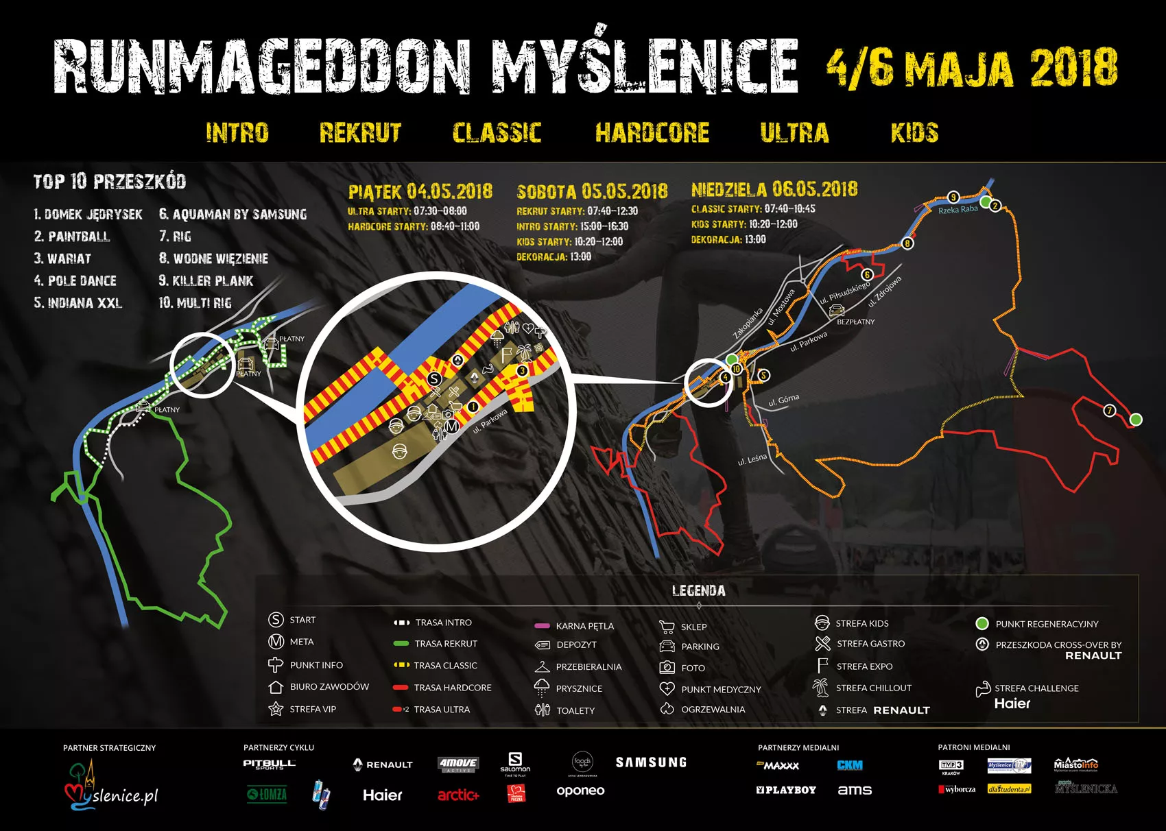 Runmageddon Myślenice będzie prawdziwym, górskim festiwalem, gdzie na zawodników czekać będą malownicze trasy, na kibiców mnóstwo atrakcji od partnerów biegu w Miasteczku Kibica oraz konkursy, niespodzianki dla małych kibiców ekstremalnych igrzysk.