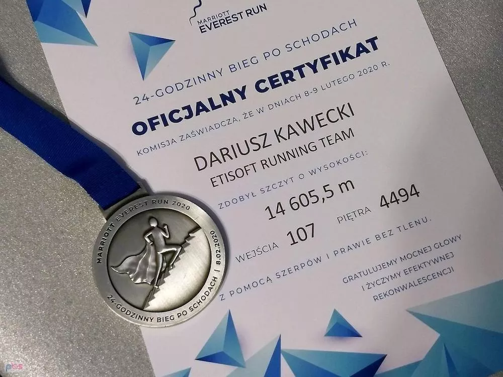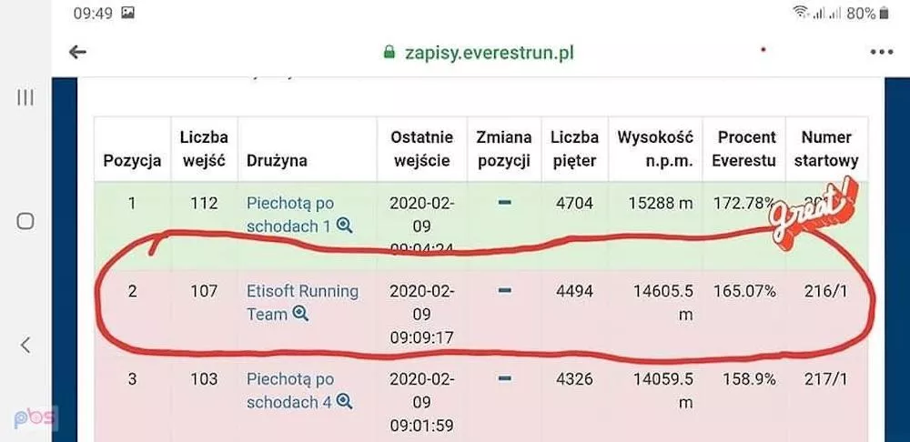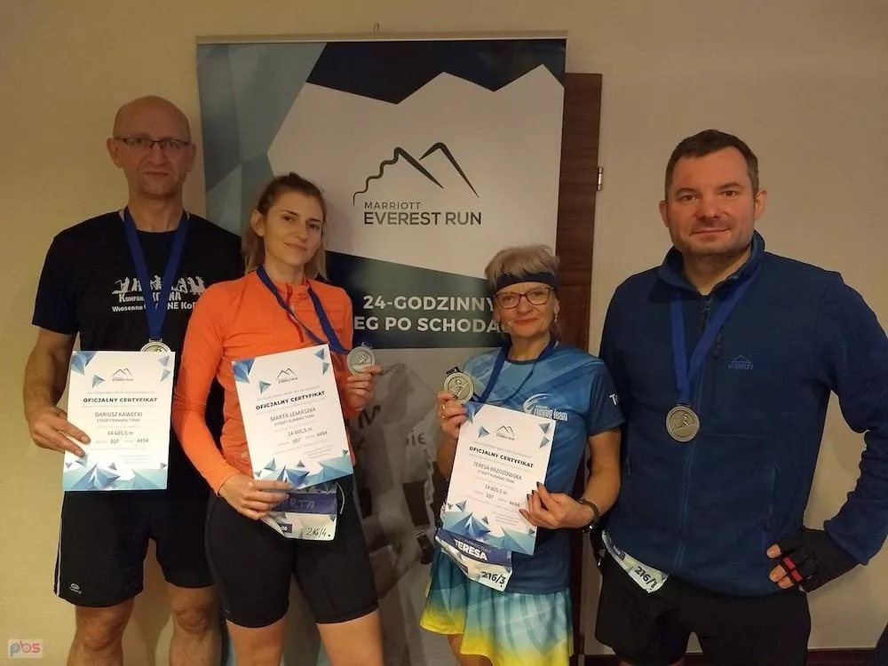 Totalni debiutanci, nie biegający wcześniej po schodach, zaliczają 107 wejść, 4494 pięter, meldują się na wysokości 14 605,5 m n.p.m., wykonują 165,07% normy i zdobywają 2 miejsce wśród sztafet!!!