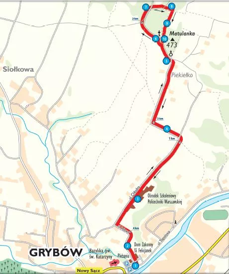 Grybowska trasa bierze swój początek obok plebanii Bazyliki pw. św. Katarzyny. Rozpoczyna się ostrym podbiegiem ul. Dębową, po czym prowadzi w ul. Chłodną. Następnie kieruje biegaczy pod górę obok Ośrodka Szkoleniowego Politechniki Warszawskiej i drogą betonową aż do granicy lasu. Przy kapliczce biegacze zakręcają w lewo w drogę leśną i dobiegają do krzyża, gdzie kierują się w lewo i wbiegają z powrotem na betonowe płyty.