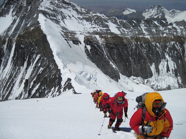 Droga do obozu na wysokości 7700m n.p.m. Ponieważ okno pogodowe (czas kiedy pogoda pozwala na wejście na szczyt) w tym roku trwało tylko półtora dnia, dlatego tak łatwo było o ten długi wężyk ludzi, którzy szli do góry.