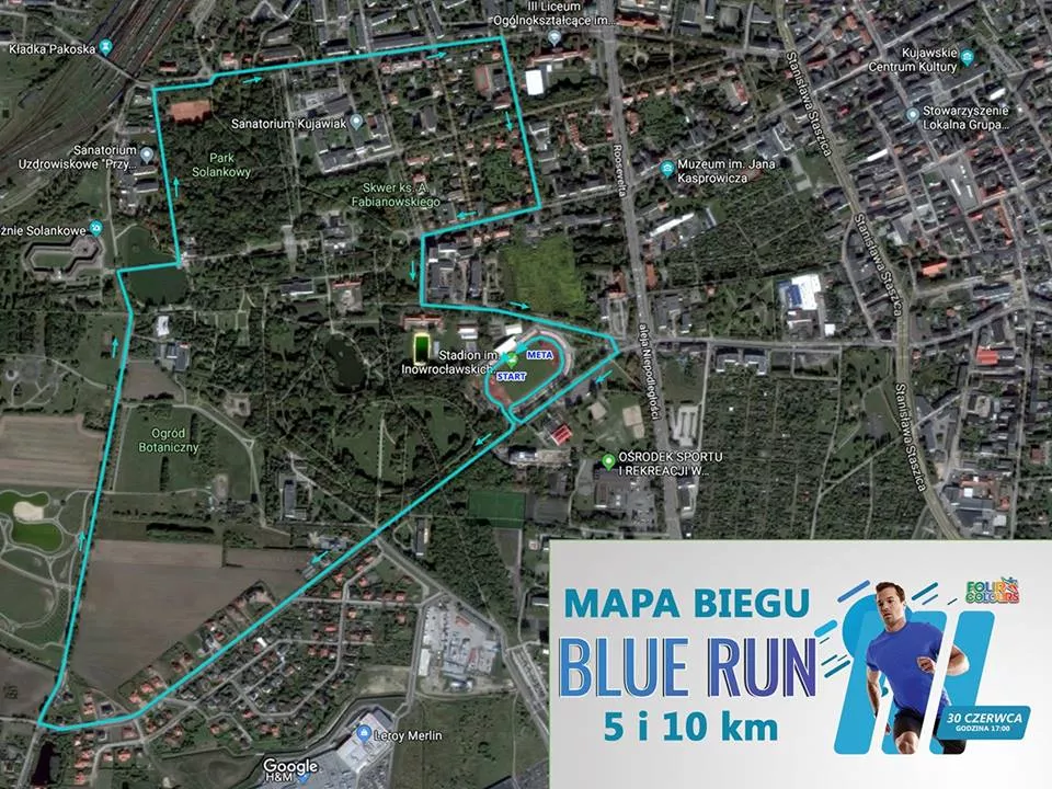Trasa tegorocznego BLUE Run będzie przebiegała alejkami Parku Solankowego i przyległymi do stadionu ulicami. Zachęcamy do zapisów internetowych lub na stadionie w biurze MKS Inowrocław od poniedziałku do piątku w godzinach 17-19.