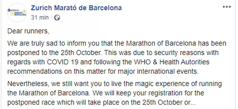 Wirus dopadł też planowany na 15 marca maraton w Barcelonie. Nowy termin to 25 października.