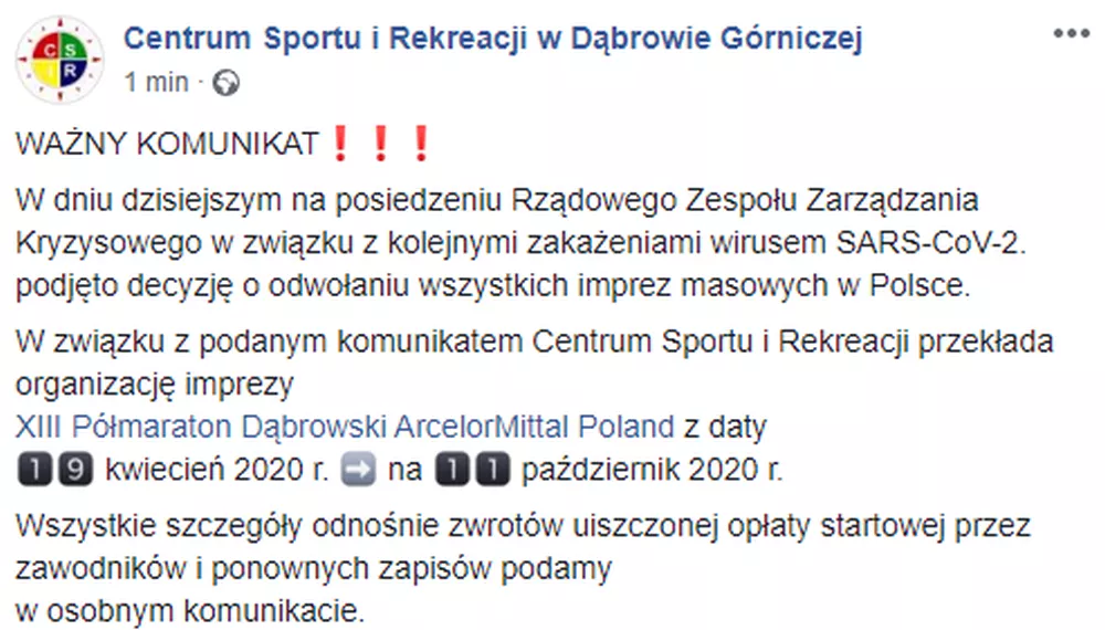 13. Półmaraton Dąbrowski ArcelorMittal Poland z daty 19 kwietnia przesunięto na 11 października 2020 r..
