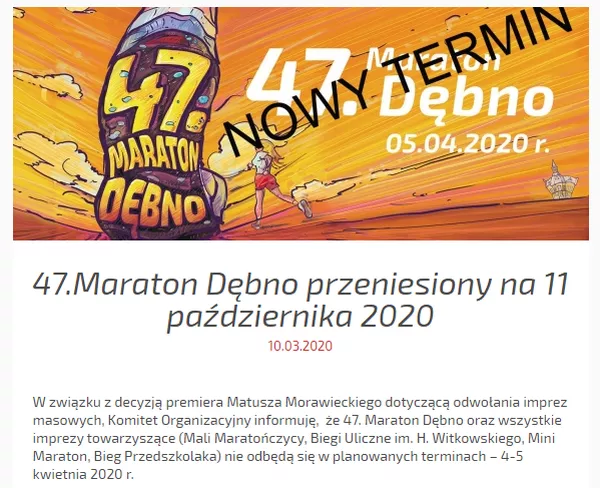Kolejny duży bieg, który został przełożony to 47. Maraton Dębno, podczas którego rozgrywane są mistrzostwa Polski kobiet na królewskim dystansie. Impreza odbędzie się jesienią.