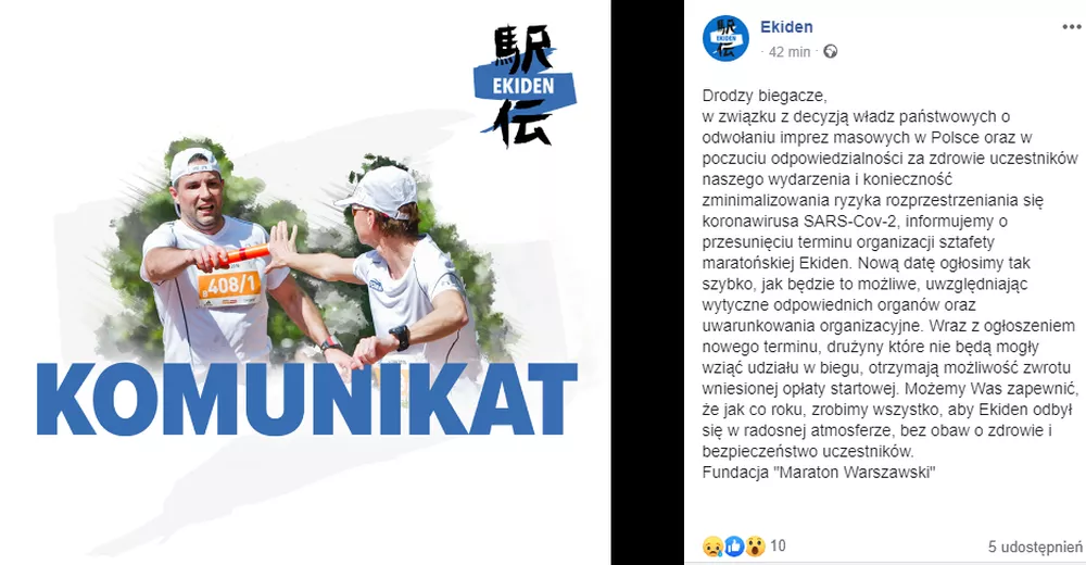 Duża impreza - Ekiden też zmienia termin z powodu koronawirusa. Organizatorzy zapewniają, że szybko podadzą nową datę sztafet, które miały odbyć się 18-19 kwietnia.