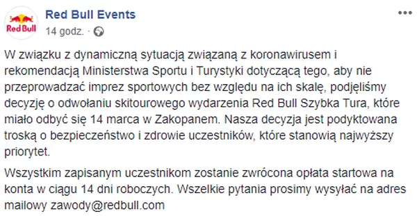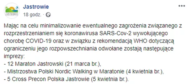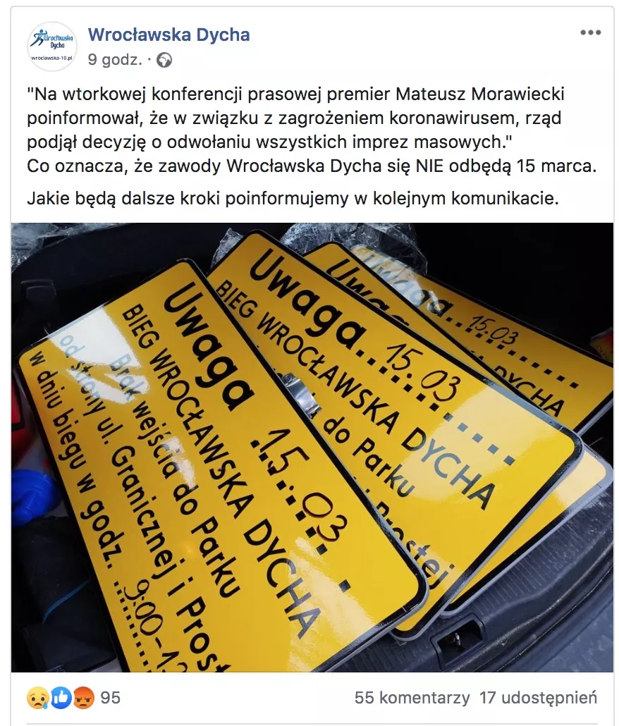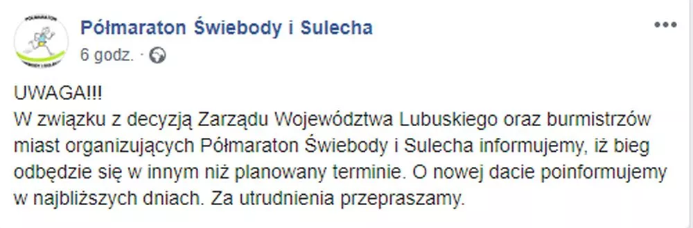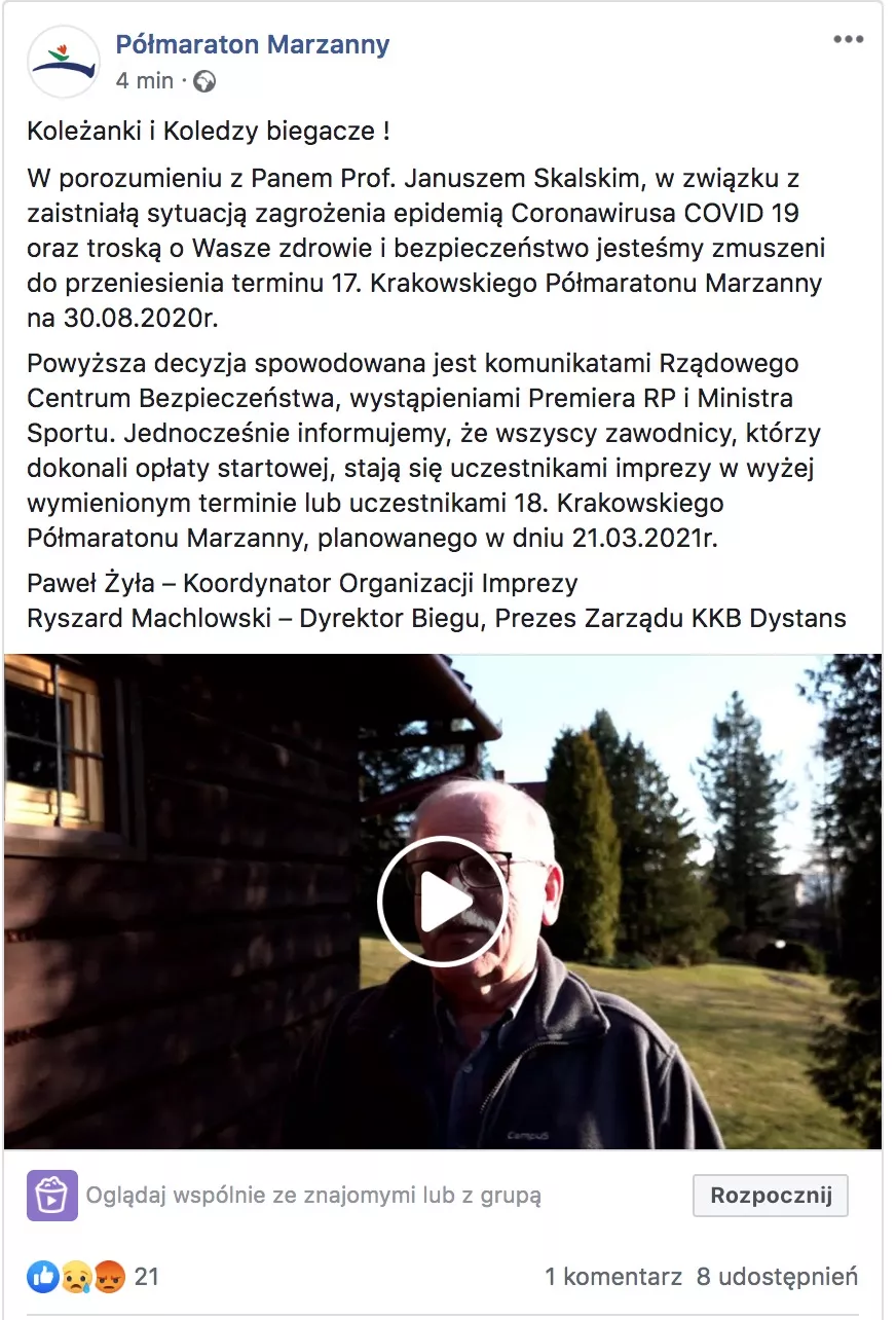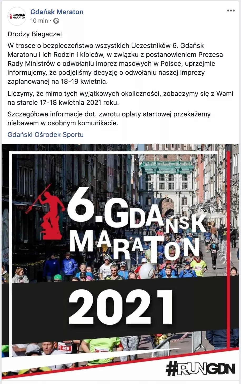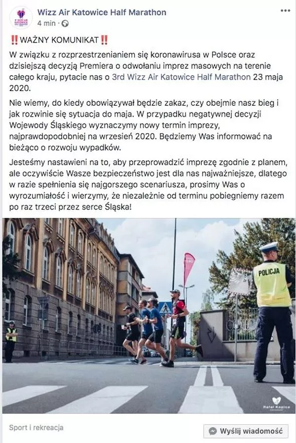 "Trwaliśmy do ostatniej chwili chcąc tak jak Wy, aby Półmaraton się odbył. To dla nas wyjątkowa jubileuszowa edycja. Ostatnie dni były dla nas dość ciężkie. Przyniosły serie informacji o rosnącej liczbie osób zarażonych koronawirusem, o podejmowanych przez władze decyzjach, które mają na celu zminimalizowanie rozprzestrzeniania się choroby na terenie naszego kraju".