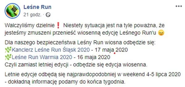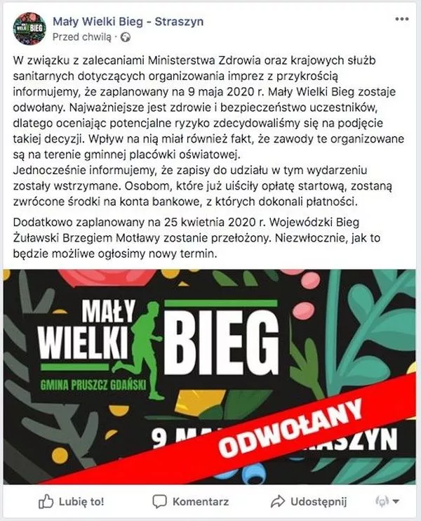 "Nie odwołujemy imprezy, a jedynie przekładamy ją w czasie. Niezwłocznie, jak to będzie możliwe ogłosimy nowy termin i wznowimy zapisy. Osoby, które już zapisały się na bieg, a nie będą mogły w nim uczestniczyć ze względu na zmianę terminu wydarzenia, otrzymają zwrot opłaty startowej."