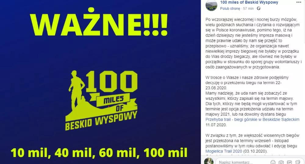 Na 22-23 sierpnia została przełożona impreza 100 Miles of Beskid Wyspowy (z 1 maja). Organizatorzy zdecydowali się także odwołać drugą ze swoich imprez - Mogielica Trail (październik).