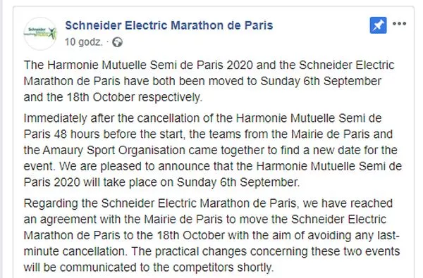 W czwartkowe popołudnie decyzję o przesunięciu imprezy na jesień ogłosili gospodarze półmaratonu i Maratonu Paryskiego. Do biegu zapisało się blisko 60 tys. osób. Nowy termin imprezy to 18 października (półmaraton 6 października).