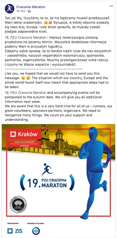 W związku z występowaniem i rozprzestrzenianiem się koronawirusa w Polsce, biorąc pod uwagę wytyczne oraz zalecenia władz centralnych i regionalnych, podjęta została decyzja o przeniesieniu organizacji 19. PZU Cracovia Maraton na jesień 2020 roku. Trwają ustalenia odnośnie nowego terminu wydarzenia. O szczegółach poinformujemy w przyszłym tygodniu.
