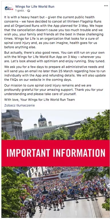 Odwołane została Salamandra Ultra-Trail (opłatę startową można przenieść na jesienne Piekło Czantorii lub uzyskać 50% zwrot), a także Wings for Life World Run w Poznaniu, ale też w pozostałych 12 lokalizacjach biegu.
