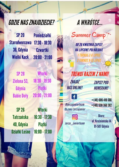 Gorąco zachęcamy dzieci i rodziców do uczestnictwa w zajęciach. Koszt to 99 zł miesięcznie. Zajęcia odbywają się 2 razy w tygodniu.