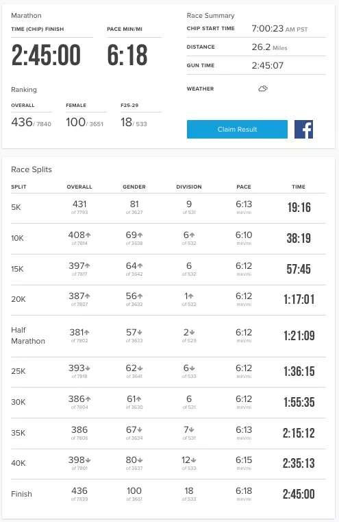 Rezultat uzyskany w Sacramento jest rekordem życiowym Amerykanki. Biegaczka ma w dorobku dopiero trzy maratony i pierwszy raz złamała granicę 2:50:00. Po międzyczasach widać, że biegła nawet na lepszy rezultat, ale dystans zrobił swoje i od 35. kilometra zaczęła zwalniać.