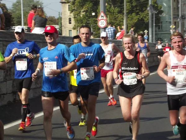 Mniej więcej około 13 km dobiegłem do Piotrka ze Szczecina, doświadczonego biegacza, który potrafił trzymać w miarę stałe tempo w okolicach 4:25-4:30. Poza tym, jak się okazało, w zeszłym roku Piotrek złamał 3h w maratonie, ale w Budapeszcie biegł właśnie na 3:10. I tak sobie biegliśmy równo do mniej więcej 20km, gdy mój towarzysz strudzony słońcem opadł z sił i poradził mi, abym biegł do przodu jednak nie szarżując zbytnio. Przede mną w końcu było jeszcze tych 10km, które dzielą biegaczy od finalnej rozgrywki na maratonie.