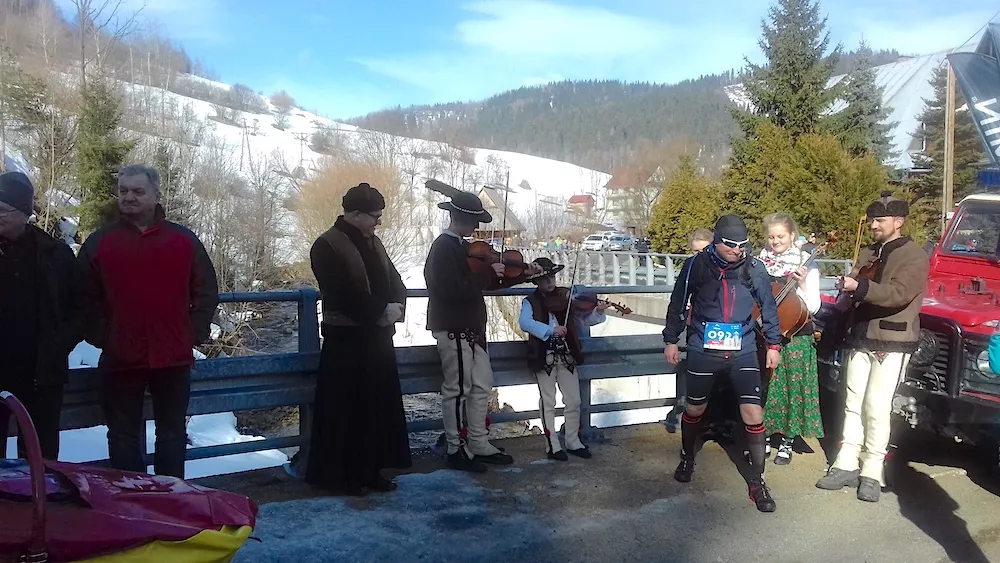 Chwycił lekki mróz, podłoże zamarzło, wszyscy mówią, że można śmiało biegać. Ruszamy w kierunku startu – dwa kilometry w dół. Tam, przy moście, czekają mobilne biuro zawodów (miło, że organizatorzy dali tę szansę tym, którzy mogli dojechać bezpośrednio na bieg), góralska kapela i organizator.