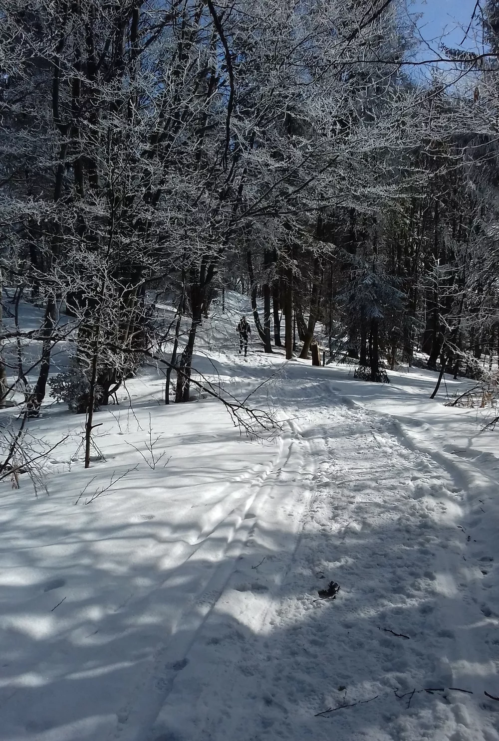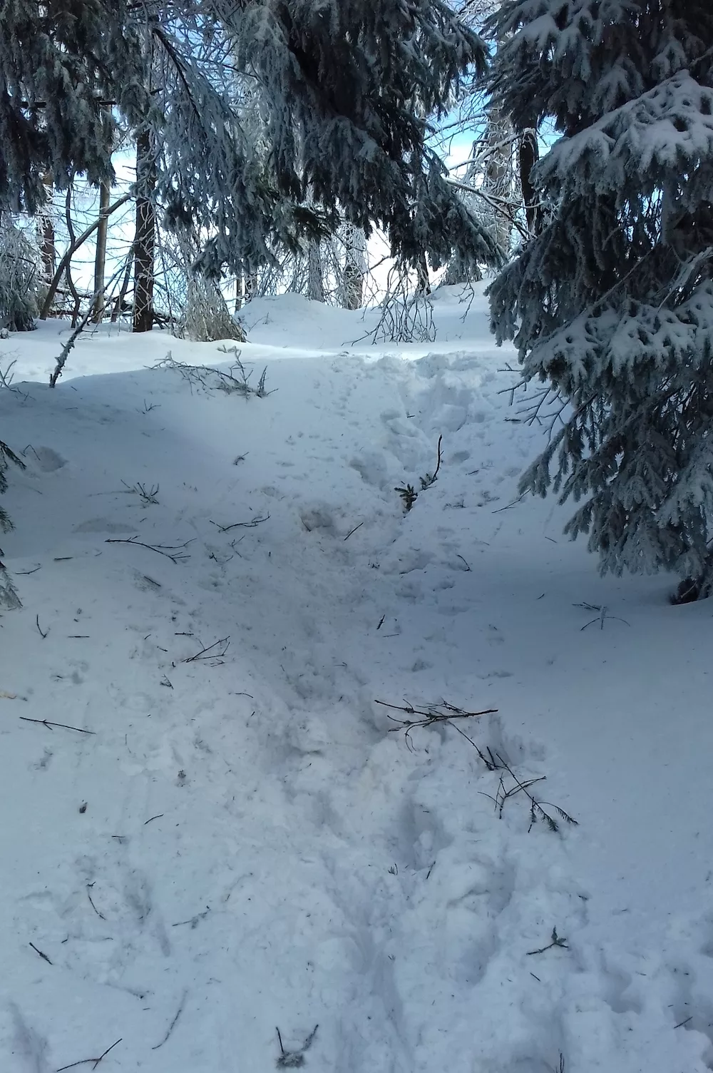 Po podbiegu kończy się asfalt a zaczyna czerwony szlak na Lubań. I śnieg. Początkowo twardy, zmrożony, można więc biec. Miejscami nogi nieco się zapadają, ale nie jest źle.
