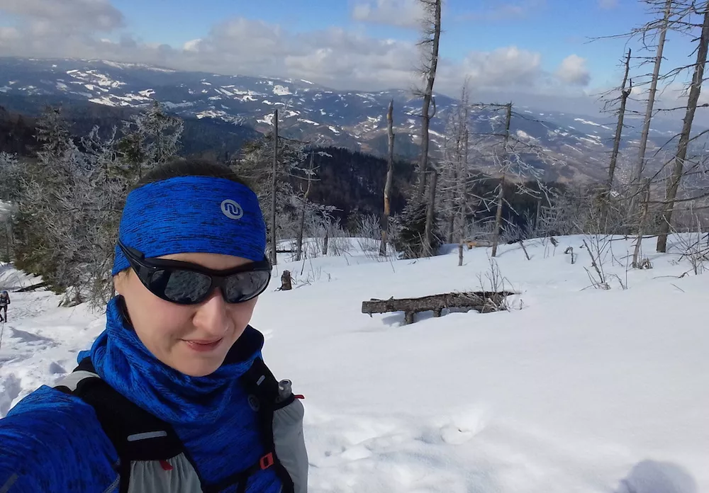 Po zejściu punkt kontrolny, pętelka wokół szczytu, zbieg żółtym szlakiem (pod górę wspinaliśmy się czerwonym, który jest krótszy i bardziej stromy). Wracamy tą samą drogą. No, prawie. Bo w tamtą stronę wydawało mi się, że biegniemy cały czas pod górę i z powrotem będzie z górki, tymczasem wciąż pokonuję kolejne wzniesienia. Biegnie się coraz trudniej – zrobiło się cieplej, śnieg zmiękł, momentami zmienił się breję, gdzie indziej nabrał konsystencji piasku, w którym zapadam się powyżej kostek. Od czasu do czasu wpadam po kolana, czasem głębiej. Miejscami można tylko iść, właściwie brnąć w śniegu.