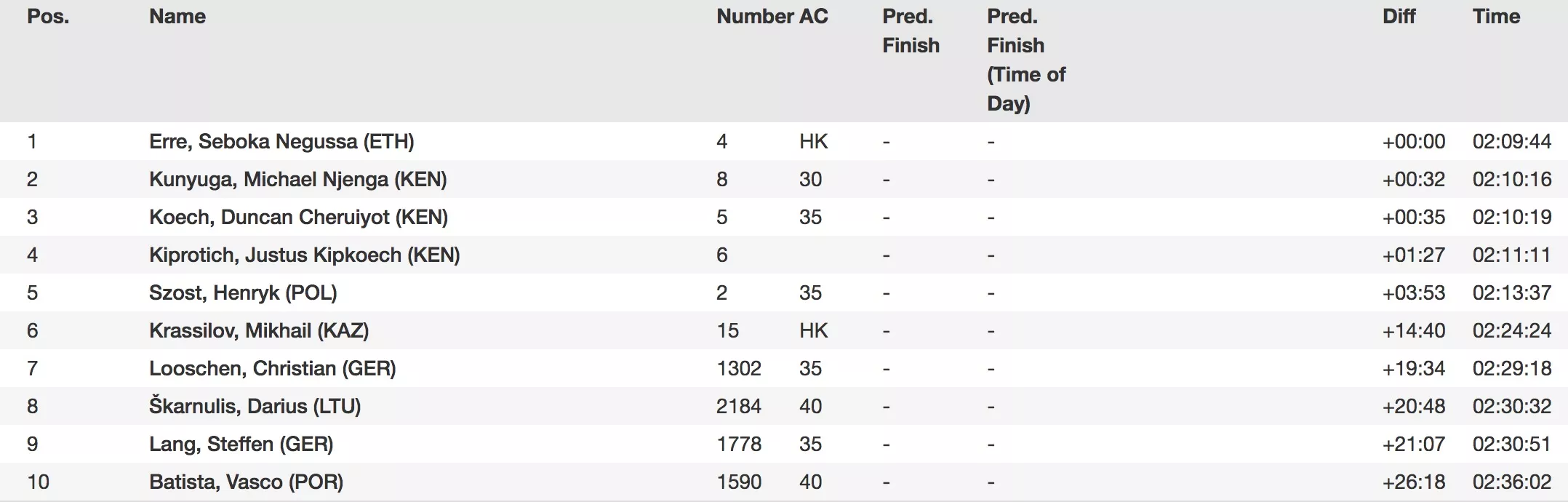 Negussa wyprzedził Michaela Njenga Kunyuga z rezultatem 2:10:16 (Kenijczyk zupełnie opadł z sił przewracając się, metę przekroczył… na czworakach.