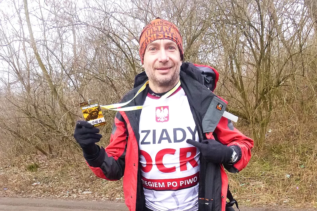Chyba niedobrze, że zaatakowałem z marszu, prawie bez chwili odpoczynku. Kulki przechodzę, ale już na drągu zaczynają mi się rozginać palce i spadam na początku kółek. Przed drugą próbą czekam kilka minut i zdejmuję rękawice. Jest lepiej, jednak wyjechane łapy puszczają o kilka kółek dalej. Już rezygnuję i idę odwalić karniaki, jednak zmieniam zdanie, namówiony przez robiącą zdjęcia Magdę z naszej ekipy Dziady OCR. Następny długi odpoczynek, rozgrzewam ręce nad koksownikiem. Trzecia próba jest najlepsza, ale spadam trzy albo cztery kółka przed końcem. Dziś nie jest mój dzień.
