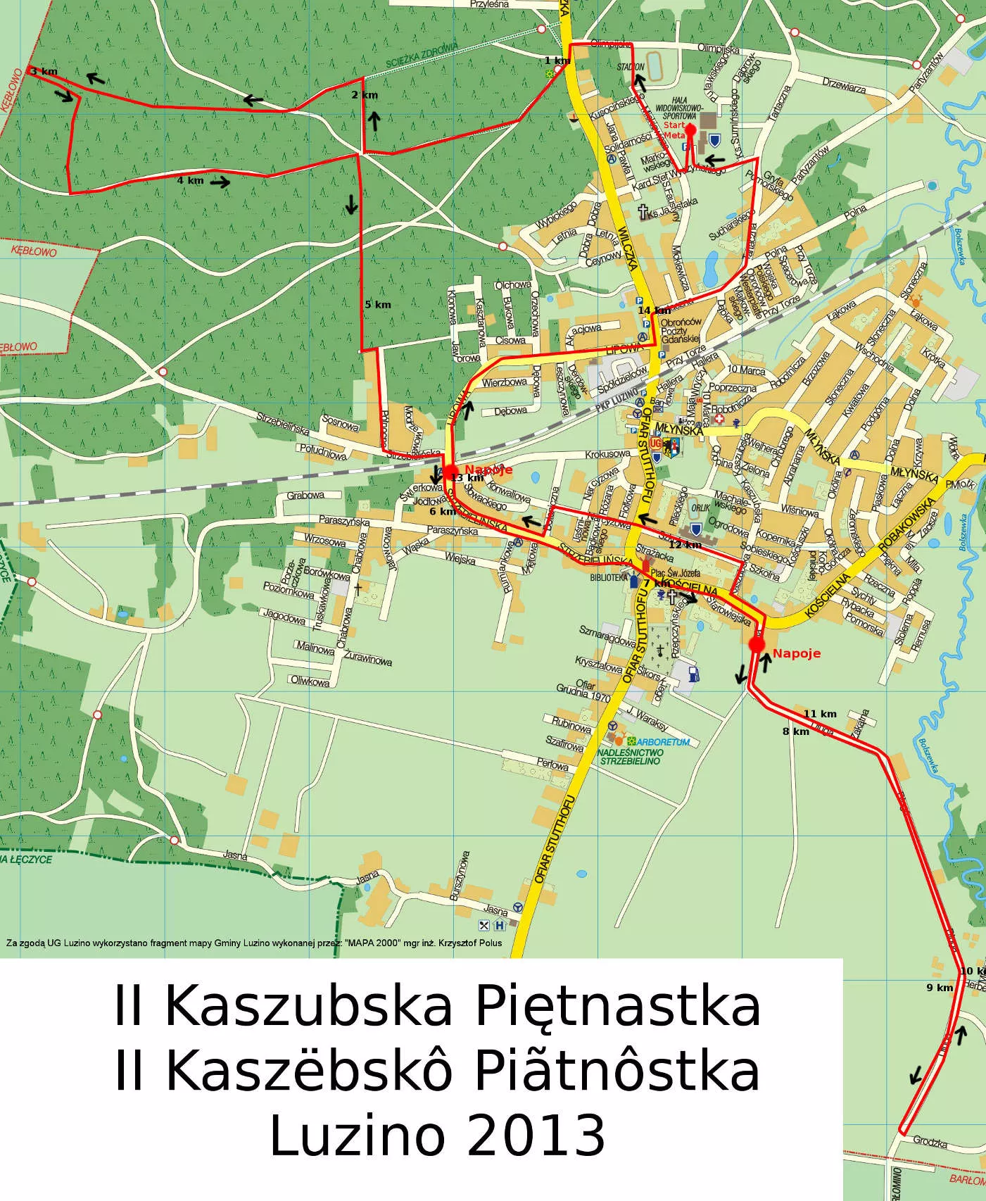 Ten prowadzi zawodników ulicami Luziny, zarówno po nawierzchniach asfaltowych, drogach gruntowych i ścieżkach leśnych. Kameralna trasa nie posiada atestu PZLA, ale jest oznaczona czytelnymi traserami, wskazującymi kierunek biegu. Oto jak opisał trasę zawodów ubiegłoroczny zwycięzca Marcin Chabowski: ?Trasa bardzo mi się podobała. Dobrze oznakowana, były wodopoje. Mało w Polsce jest takich tras, że biegnie się trochę po lesie i trochę po ulicy? ? powiedział w rozmowie z portalem wejherowo.naszemiasto.pl.