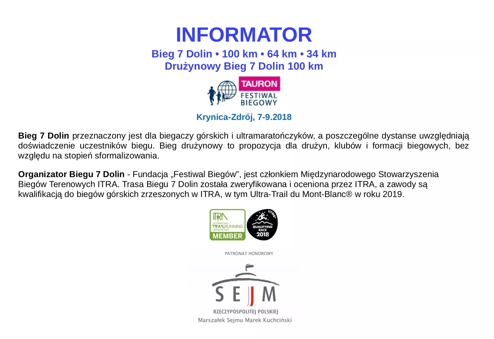 Opis trasy, limity czasowe i godzinowe, oznakowania, zasady rywalizacji, godziny startu, bezpieczeństwa i kontroli prawidłowego przebiegu rywalizacji, informacje o odprawie, transporcie, depozytach, punktach przepakowych / żywieniowych oraz odpowiedzi na najczęściej zadawane przez Was pytania. Wszystko to znajdziecie w INFORMATORZE Biegu 7 Dolin 100, 64, 34 km / Drużynowego Biegu 7 Dolin 100 km (kliknij poniższą w grafikę by otworzyć).
