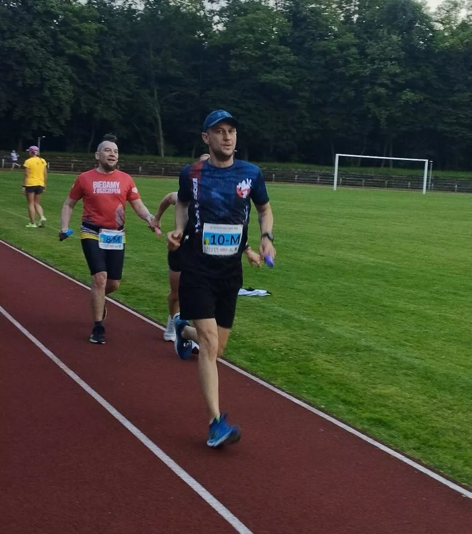 Start jak zwykle o godzinie 19, na pierwszą zmianę lecą Panowie. I zmiana- oczywiście na początku trochę pomarudzę. Tyle co dzień wcześniej trener mówił żebym nie spaliła się na początku- to jednak 400m które robi się w szybkim tempie. Wiec jak na przystało- pierwsze kółka przycisnęłam i zdechłam. Na dodatek mój partner był diabelnie szybki- gościu tydzień wcześniej robił sztafetę z Helu na Morskie oko, liczyłam na chociaż lekkie zmęczenie z jego strony… Ale się przeliczyłam.