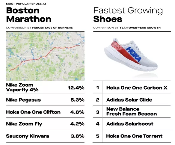 Najbardziej popularnym butem wśród użytkowników aplikacji startujących w Maratonie Bostońskim był - tu nie ma zaskoczenia - Nike Zoom Vaporfly 4 %(12,4 %). Drugie miejsce zajął Nike Pegasus (5,3 %), a trzecie Hoka One One Clifton (4.8 %). Natomiast modelem, który zyskuje największą popularność jest Hoka One One Carbon X, który wyprzedził model Adidasa Solar Glide.