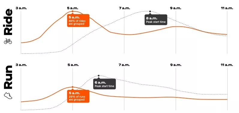 Przez rok użytkownicy Stravy wybiegali łącznie 1,3 miliarda kilometrów. Średnia długość „trasy” to ponad 6,5 km, a średni czas trwania aktywności - 40 minut i 26 sekund. Wskaźnik oczywiście różni się jeszcze w zależności od krajów; w USA dystans był bardzo zbliżony, ale już czas trwania aktywności był krótszy – 37 minut i 34 sekundy. A jeśli trening, to najchętniej rano.