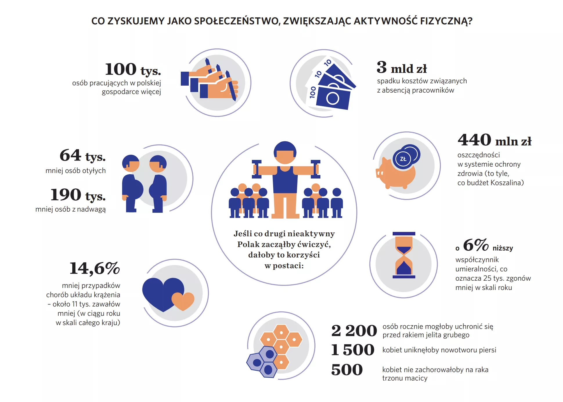 Zwiększenie aktywności fizycznej przyniosłoby wymierne korzyści społeczne; jeśli co druga, nieaktywna fizycznie osoba, zaczęłaby ćwiczyć to, m.in.:- liczba zawałów mogłaby spaść o blisko 11 000,